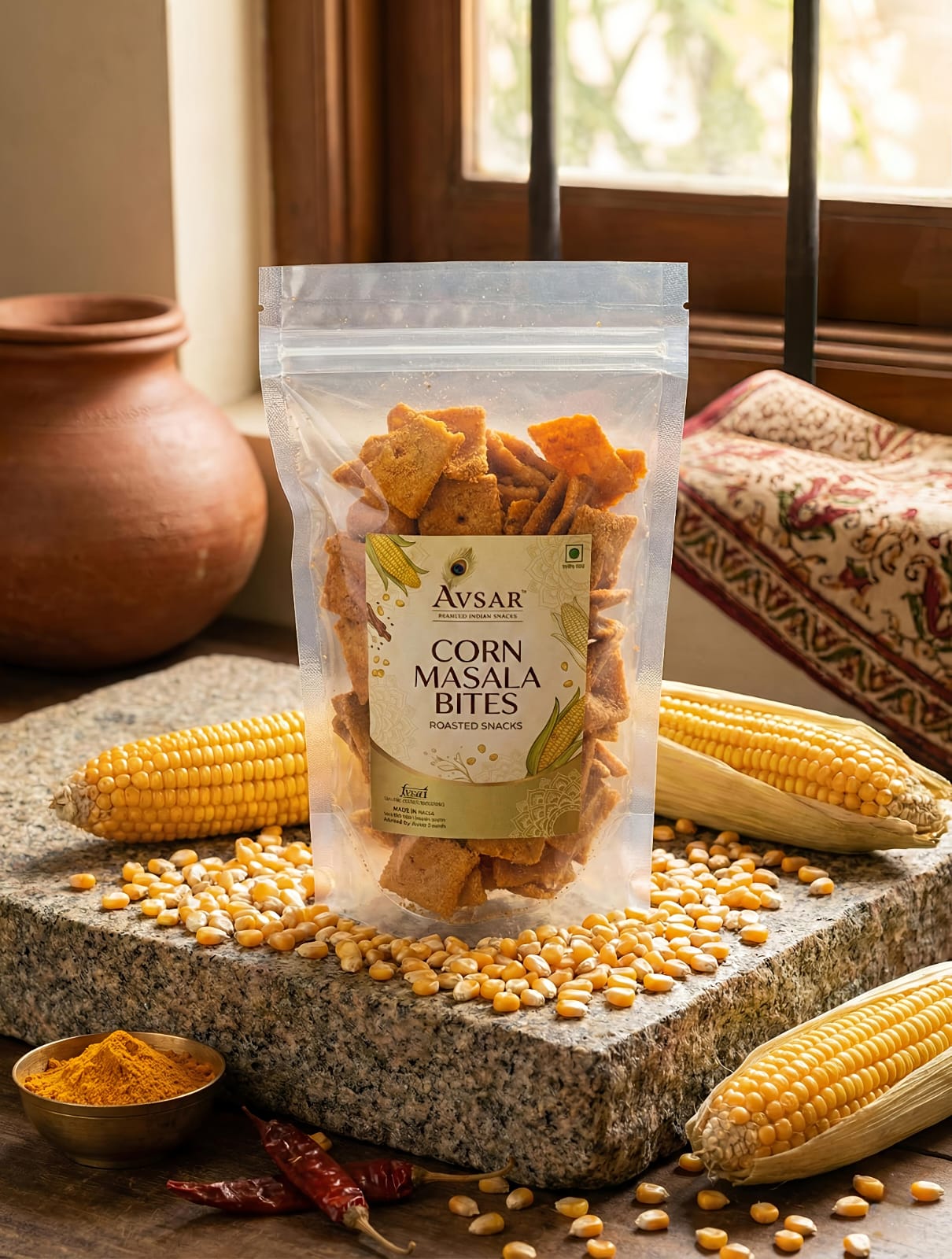 Corn Masala Bites are crunchy snacks made from makka flour and seasoned with a bold, chatpata spice blend. Perfect for those who love a tangy, masaledar crunch.